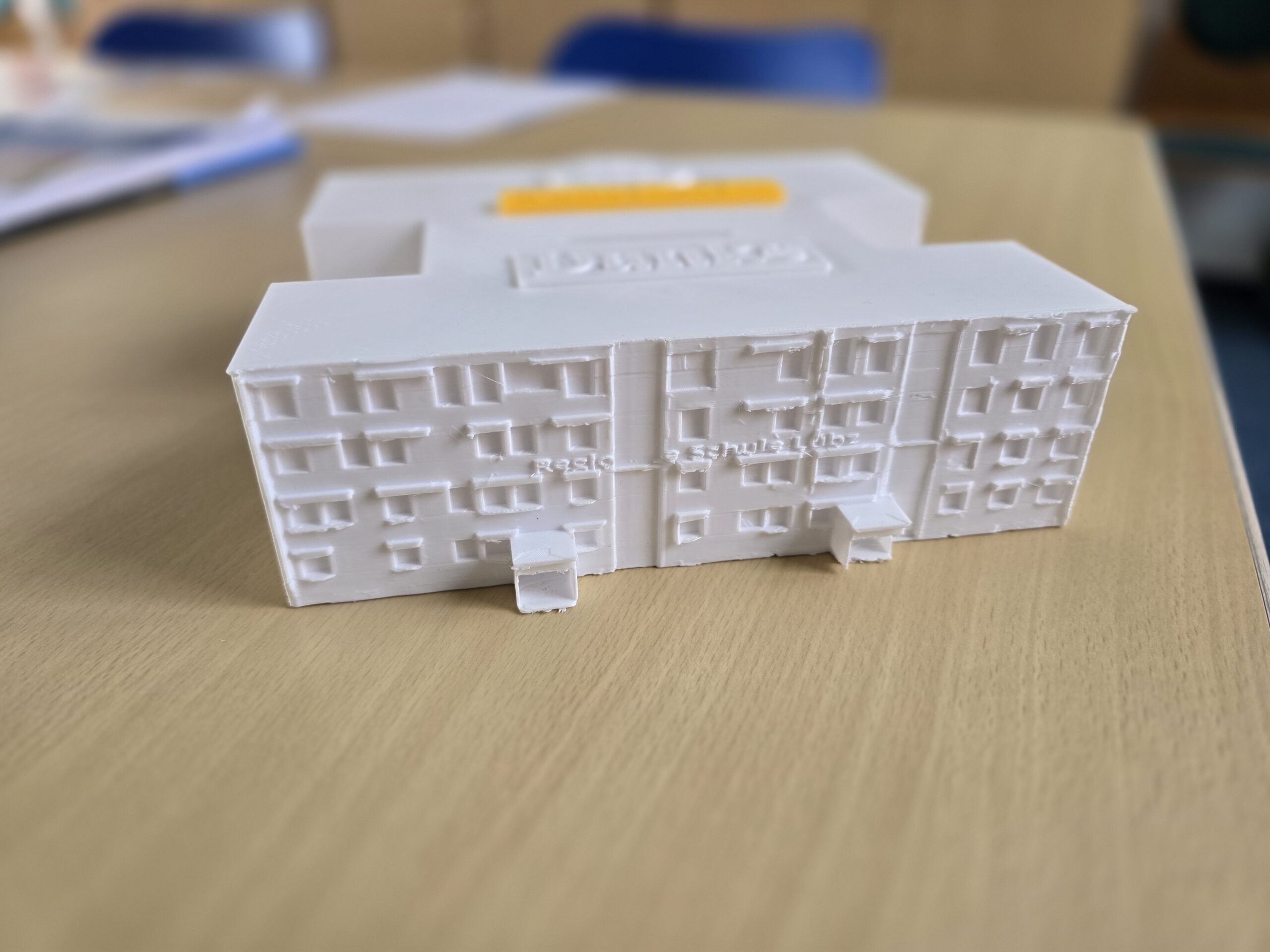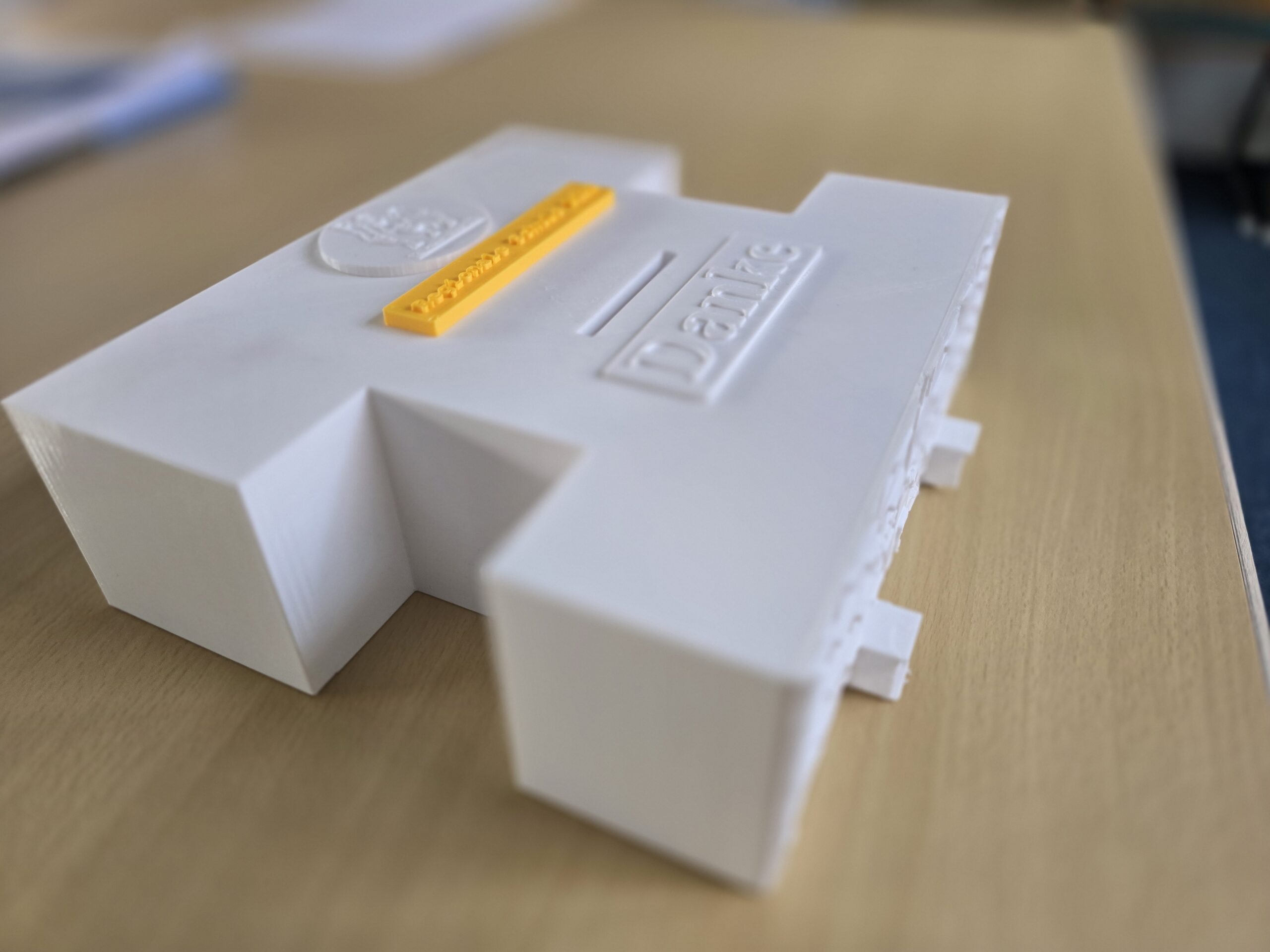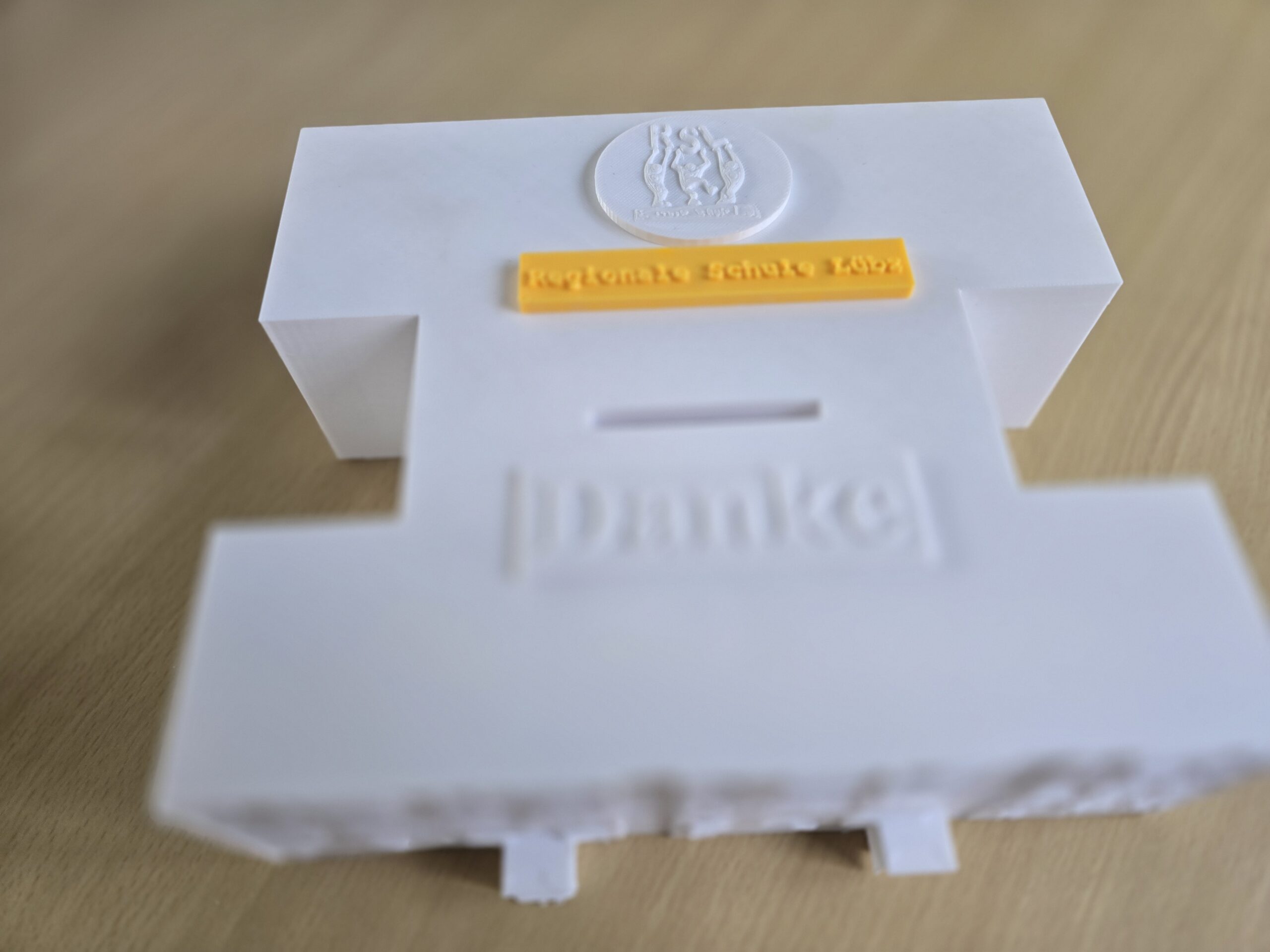 Für unser erstes großes Druckprojekt haben wir eine Spendendose in Form unserer Schule erstellt. Wir hoffen, dass diese bald kräftig gefüllt wird, um die Kosten für den Drucker wieder reinzuholen.
